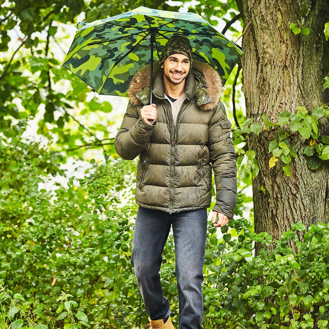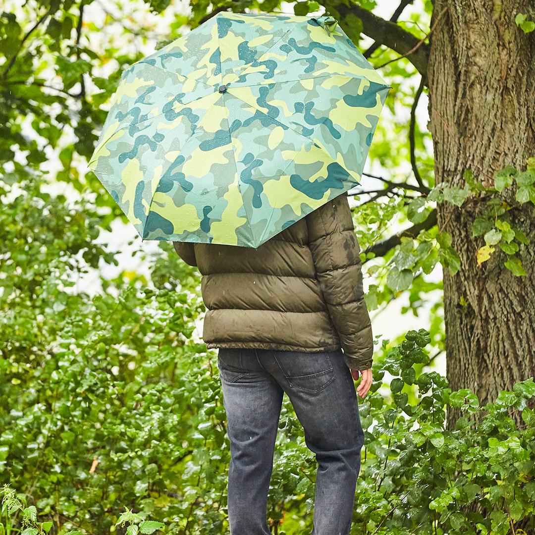 Früher diente das Camouflage-Muster zur Tarnung. Heute bewirkt es ganz bewusst das Gegenteil. Als cooler Modetrend stellt es sich zur Show, hebt sich von der Masse ab. Maskulin, kernig, selbstbewusst. Und genauso kommen Sie mit diesem Taschenschirm daher – ob beim Streifzug durch die City oder beim Ausflug ins Grüne. Wählen Sie einfach die lässige Farbvariante, die zu Ihnen und Ihrem Outfit passt. Und schon sind Sie weder aufzuhalten, noch zu übersehen.