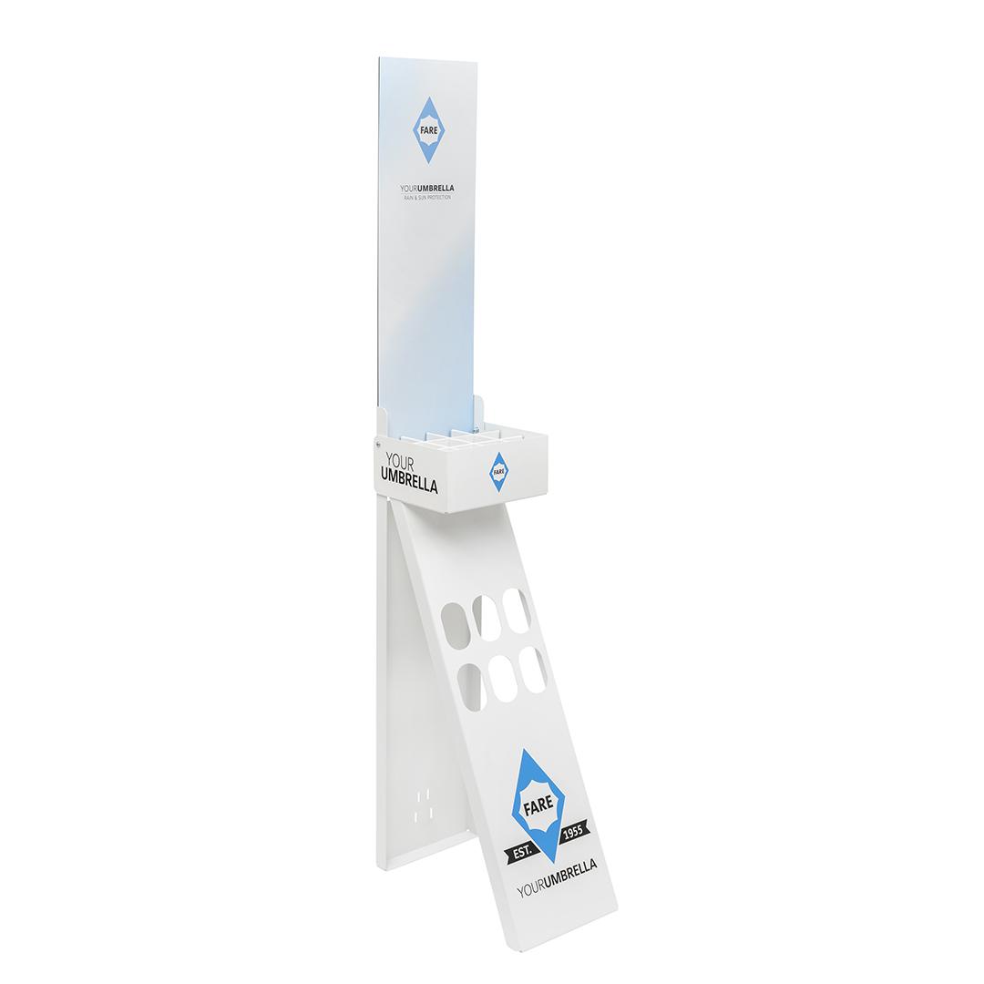 Mit diesem hochwertigen FARE® Schirmdisplay präsentieren Sie Ihre Regenschirme aufmerksamkeitsstark direkt am Point of Sale. Das stabile Metalldisplay sorgt für eine übersichtliche, wertige Warenpräsentation im Verkaufsraum oder Showroom.