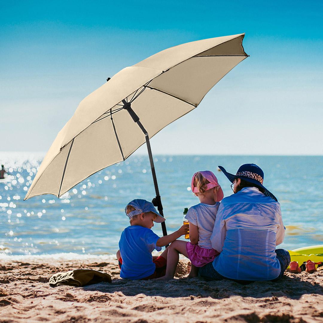 Der Sonnenschirm bietet keinen vollständigen UV-Schutz. Bitte die seitliche UV-Strahlung beachten. Weitere Sonnenschutzmaßnahmen werden empfohlen. Es handelt sich nicht um Persönliche Schutzausrüstung (PSA). Weiterführende Information zum UV-Schutz erhalten Sie beim Bundesamt für Strahlenschutz: www.bfs.