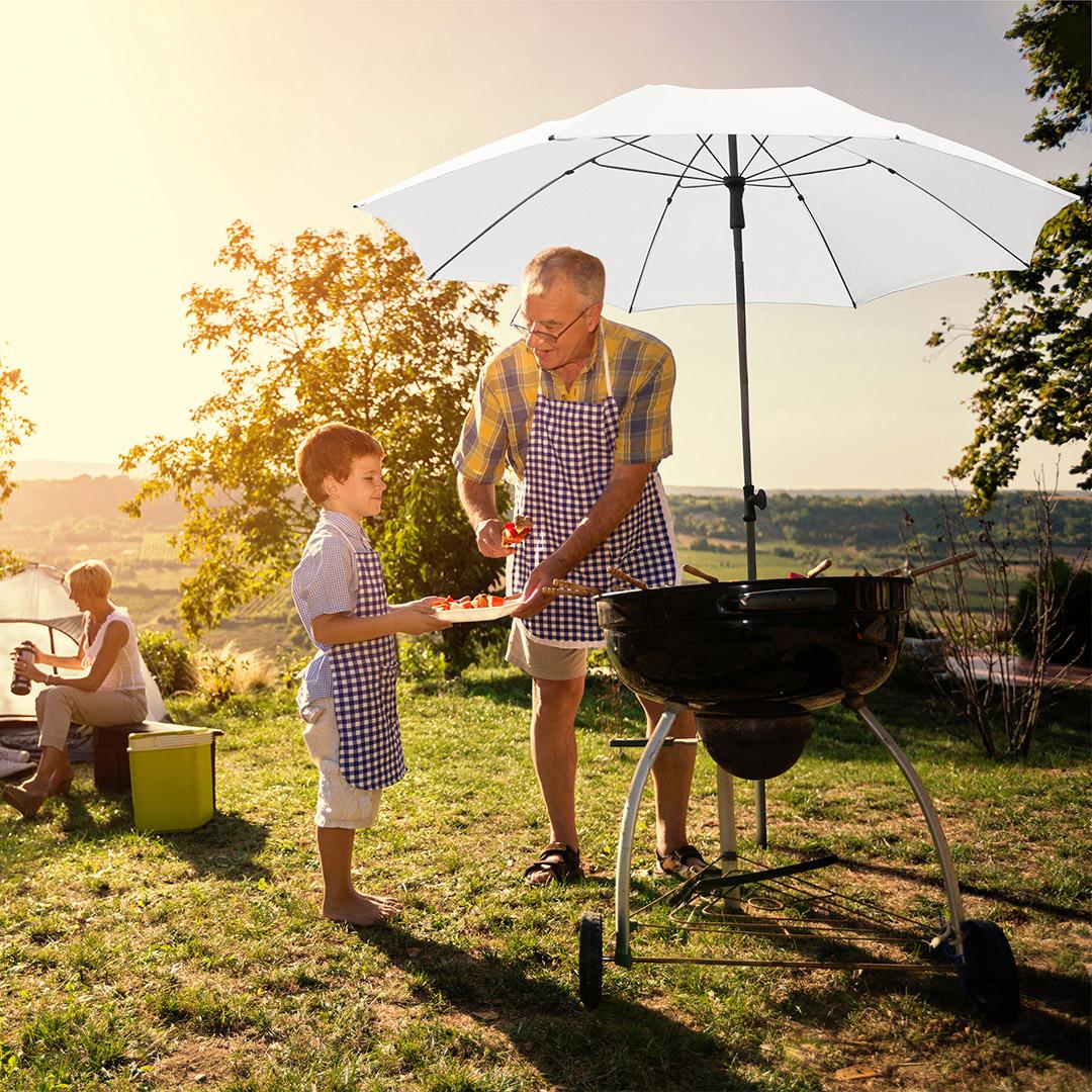 With a diameter of 240 cm and a folding mechanism for tilting the umbrella, you can really enjoy the UPF 50+ sun protection. Even on your XL sun lounger or with friends in the park, you are reliably protected from UV radiation. By the way, this parasol is also great in small details: in gusts of wind, an overlapping ventilation cover regulates the excess pressure. On the practical side, the parasol scores points with its infinitely variable height adjustment, a safety slide for easy handling and a comfortable carrying case. Great, isn't it?