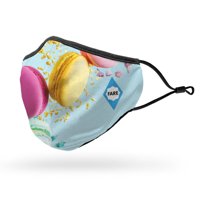 Vollflächig individuell gestaltbare Behelfs-Mund-Nasen-Maske mit verstellbaren Elastikbändern und Einschubmöglichkeit für einen Filter
